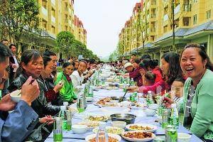 修文县龙潭社区易地扶贫搬迁安置点居民搬迁一年后齐聚一堂共庆乔迁之喜。