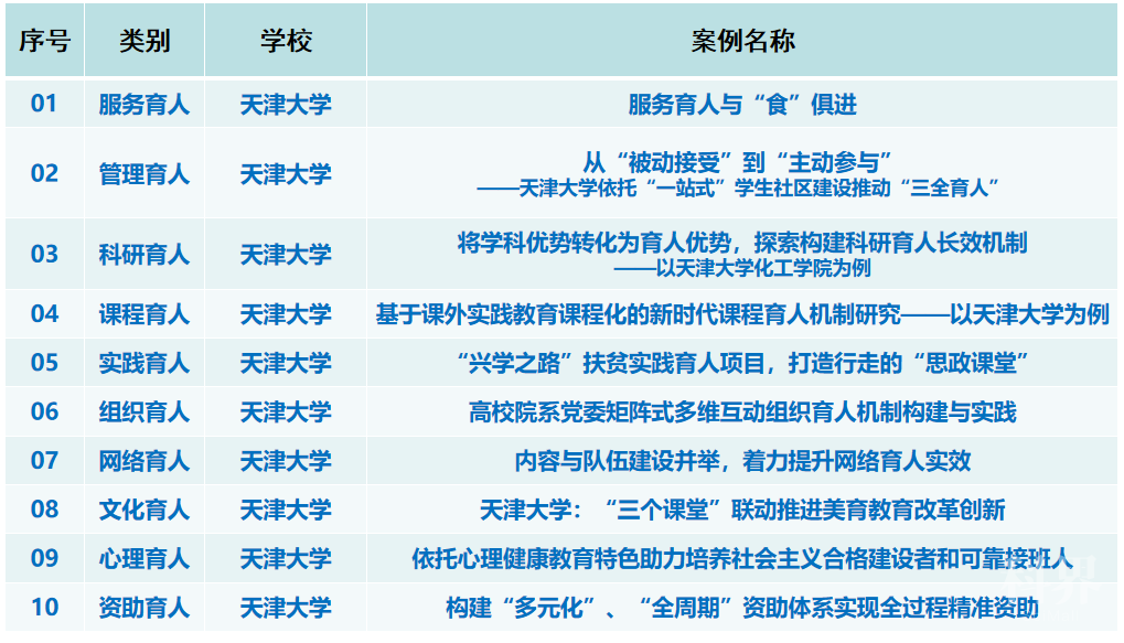获奖的10个项目特色鲜明,体现了我校在“十大育人体系”各方面的有益探索。《服务育人与“食”俱进》案例,提炼了学生食堂开展食育教育的经验举措,推动食堂服务质量、服务环境、劳动教育载体等与育人相结合。《从“被动接受”到“主动参与”——天津大学依托“一站式”学生社区建设推动“三全育人”》案例聚焦管理育人,创新社区育人体制机制,切实发挥好党建引领作用。《将学科优势转化为育人优势,探索构建科研育人长效机制——以天津大学化工学院为例》案例,展示了化工学院加强科教融合、推进产学研协同、强化“三全育人”学术保障,发挥科研育人重要作用的具体做法。《基于课外实践教育课程化的新时代课程育人机制研究》案例注重在课外实践教育课程的顶层设计、渠道拓展、内涵式发展方面重点发力,不断提升课程的系统性、规范性和精品化。《“兴学之路”扶贫实践育人项目,打造行走的“思政课堂”》案例,把社会实践作为创新高校育人机制、促进学生全面发展的突破口,形成了可复制、可推广、具有天大特色的实践育人模式。《高校院系党委矩阵式多维互动组织育人机制构建与实践》案例,建设四项教育内容、四支育人队伍、四处教育阵地、四项运行保障,形成了特色思政教育“四四矩阵”多维互动工作机制。《内容与队伍建设并举,着力提升网络育人实效》案例依托“天外天”网络平台,紧抓队伍建设,锤炼内容输出,构建网络育人全媒体矩阵。《“三个课堂”联动推进美育教育改革创新》案例,促进艺术与科学、技术、人文交叉,推动美育教育改革创新,更好地发挥文化育人功能。《依托心理健康教育特色助力培养社会主义合格建设者和可靠接班人》案例,将“育心”“育人”“育德”有机结合,充分发挥心理育人在安全保障、健康促进、人格塑造和价值引领中的积极促进作用。《构建“多元化”“全周期”资助体系实现全过程精准资助》案例,通过探索经济帮扶之外的“多元化”物资帮扶项目、构建“全周期”的资助育人平台,实现了全过程精准资助和全方位资助育人。