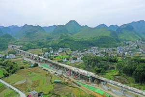 图为施工建设中的贵南高铁广西都安瑶族自治县永安多线特大桥(2021年12月29日摄,无人机照片)。
