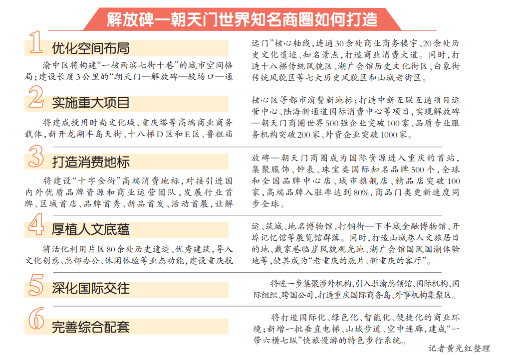 下一步,我市将主要从优化空间布局、实施重大项目、打造消费地标等六个方面,打造解放碑—朝天门世界知名商圈。