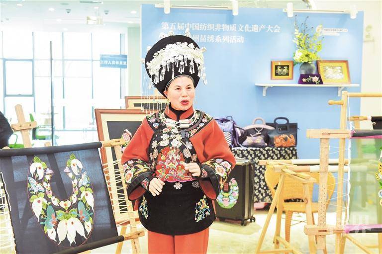 2021年12月28日,寒冬中的贵阳冰雪尚未消融,但位于双龙经济开发区的国际山地旅游联盟总部基地却是一派火热。第五届中国纺织非物质文化遗产大会暨多彩贵州苗绣系列活动在此召开,在这场国内目前非遗大类中唯一由国家级行业组织举办的非遗品牌盛会上,最新行业指导意见的发布、多个颁奖礼的举行、参展商各亮“绝活”,都在为贵州苗绣持续加温。