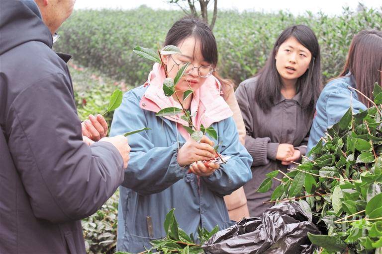 研究人员修剪茶树穗条。