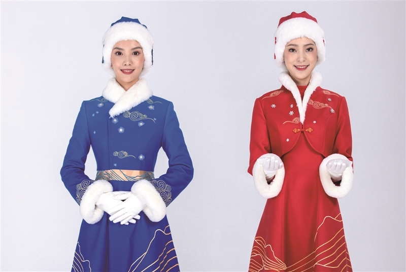 该颁奖礼服分为红色和蓝色两款连衣裙,蓝色采取交领右衽,红色采用对襟旋袄。衣服上有祥云和雪花的图案,领口、袖口、帽檐都缝制了白色绒毛。