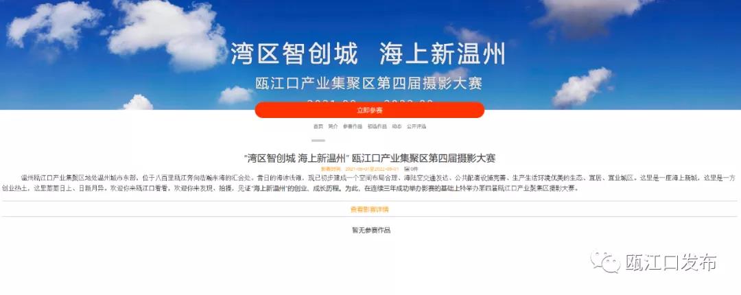 为了更好地宣传推广,征集作品,在线评选。特在影像传媒网开设《瓯江口产业集聚区第四届摄影大赛》官网(二级域名#)影赛结束后影赛官网将作为瓯江口产业集聚区图片网继续在线展示,永续利用。
