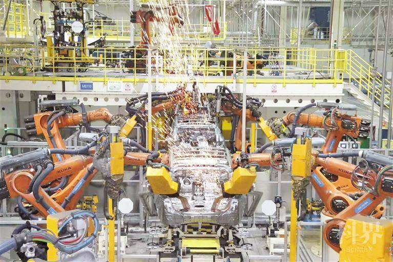 图为吉利汽车公司焊装车间机器手正在进行焊接作业。