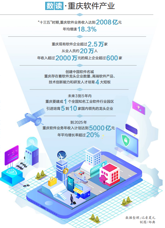 据了解,“十三五”时期,重庆软件业务收入达到2008亿元,年均增速18.3%;全市现有软件企业超过2.5万家,从业人员约20万人,年收入超过2000万元的规上企业超过600家。特别是围绕中国软件名城这一目标,重庆已提出一揽子发展举措。