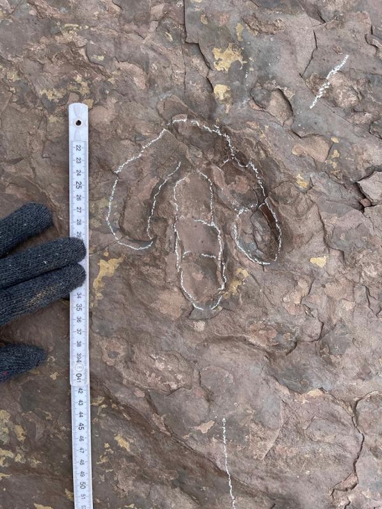另外两个孤立的足迹被分别归为了实雷龙足迹类和跷脚龙足迹类。被识别为实雷龙足迹的脚印较大,且显示出了明显的外边缘,然而该处没有发现连续的足迹序列,反映造迹者可能踏入了一个底质较软的区域,随后又行进至较硬的地面,因此其他足迹没有留下,也可能是其他足迹在石化之前就已经风化了。被识别为跷脚龙足迹的脚印则较小,并且保存较差,只能大致识别出足迹边缘。