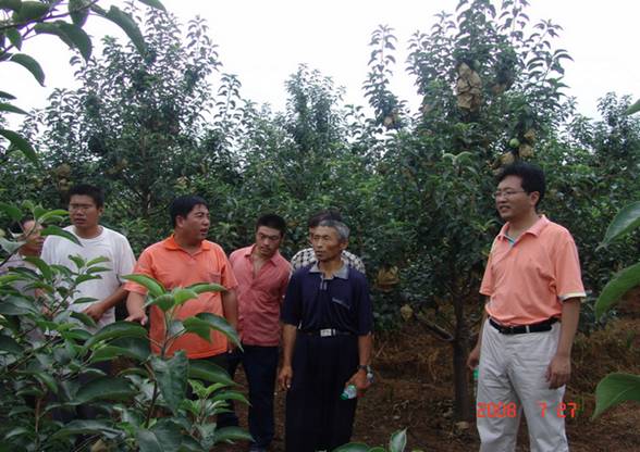 果树所果树应用技术研究中心副主任王海波(左四)在新疆正在进行现场指导