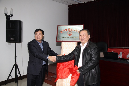 果树所副所长程存刚(左一)为果业经纪人专业委员会的成立揭牌