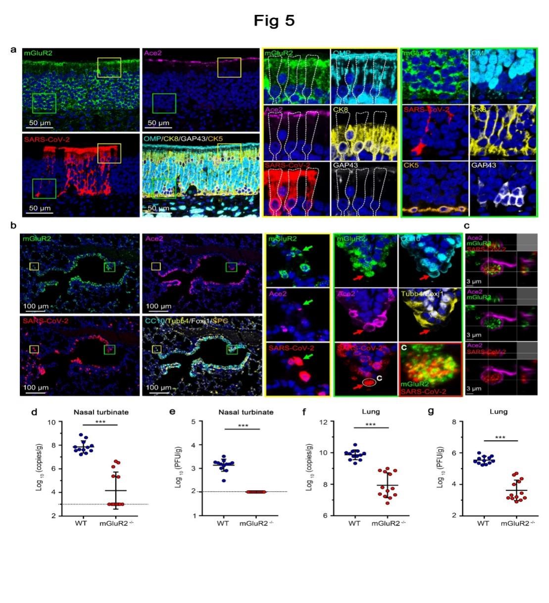 SARS-CoV-2利用其囊膜纤突蛋白(S)识别细胞ACE2受体启动感染,但参与病毒入侵细胞过程的其他宿主分子尚不十分清楚。该研究发现,mGluR2通过与SARS-CoV-2 S蛋白直接互作,协同ACE2介导SARS-CoV-2内化进入细胞。利用团队早期建立的小鼠感染模型,证明敲除mGluR2基因可阻止小鼠鼻腔的SARS-CoV-2感染,显著减少肺部的病毒感染。值得注意的是,mGluR2在SARS和MERS冠状病毒入侵细胞的过程中同样发挥重要作用。