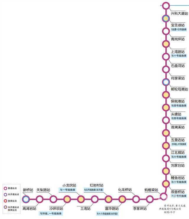 即将开通运营的重庆轨道9号线一期,起于新桥站,止于兴科大道站,全长约33公里,共计26个站点,此次计划开通23个站点,有3个站点暂不开通。