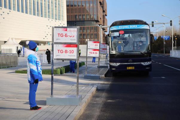 1月10日在主媒体中心外拍摄的交通班车乘车点。新华社记者 徐子鉴 摄