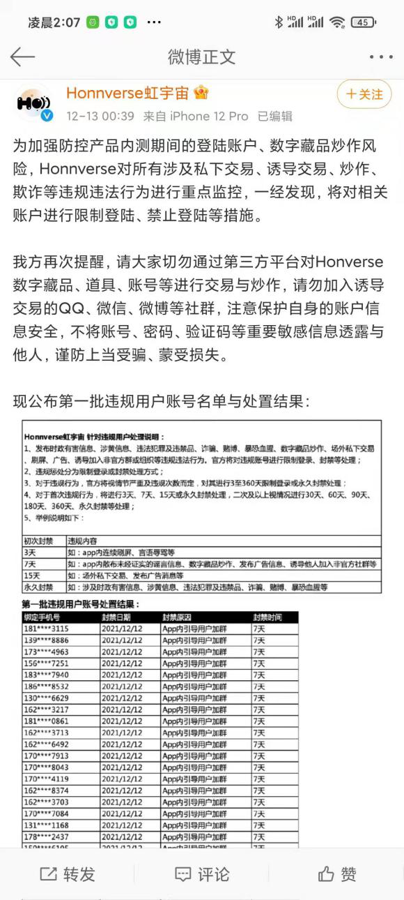 12月10日,虹宇宙再次表示,会对所有涉及私下交易、诱导交易、炒作、欺诈等违规违法行为进行重点监控,一经发现,将对相关账户进行限制登录、禁止登录等措施。并于12月13日重申这条提醒并公布了第一批违规用户的账号名单与处置结果。