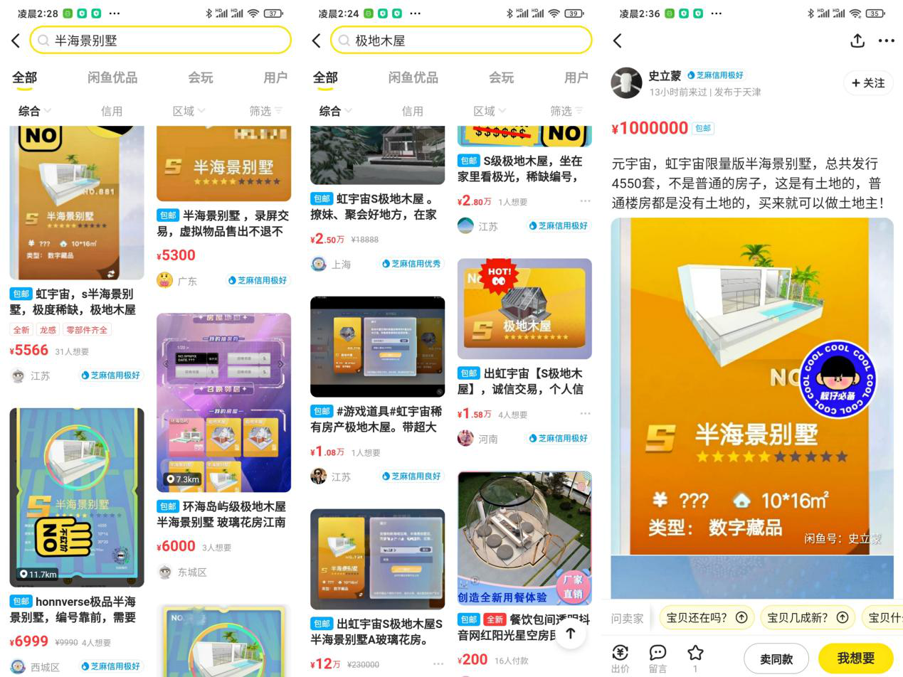 日前,新京报贝壳财经在二手交易平台闲鱼上看到,有许多虹宇宙相关的虚拟房产交易。以极地木屋和半海景房为例,其价格从数千元到数万元不等,个别虚拟房子标价甚至高达100万元。交易方式为,买家付款,然后卖家通过虹宇宙平台内部把房产转赠给买家。