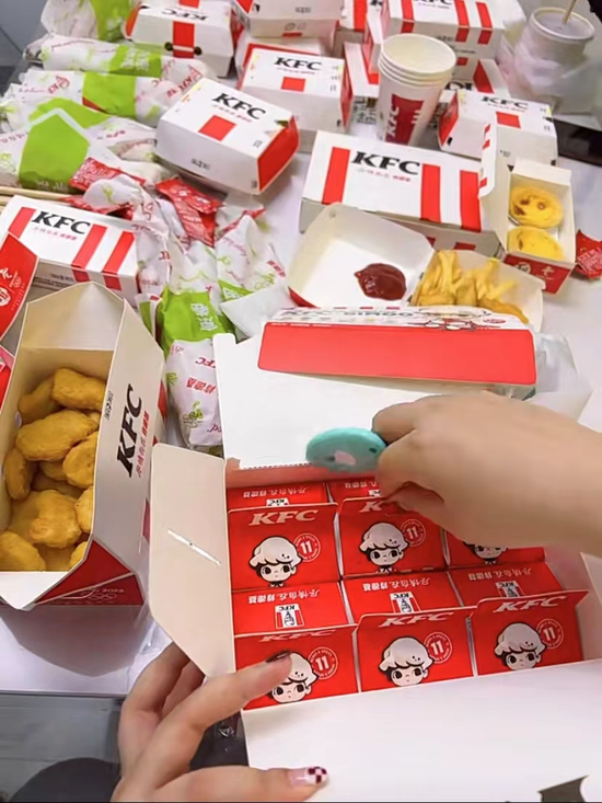 由此,此次营销引发一系列“消费奇观”。例如,抽到盲盒将套餐当场丢弃;家中冰箱被肯德基套餐塞满,能让多人连续吃上好几天;一次性购买几十份套餐分发亲友;在网络上花钱请人“代吃”肯德基等等。