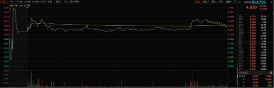 1月12日,恒大汽车早盘一度大涨超7%,截至收盘,恒大汽车收于4.03港元/股,上涨3.33%,市值437亿港元。