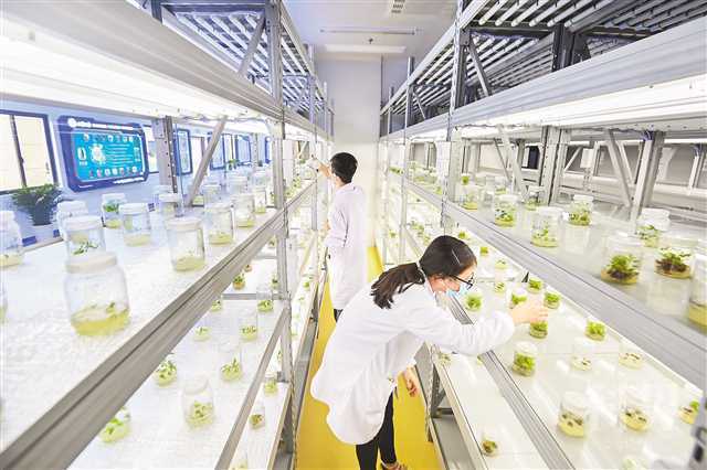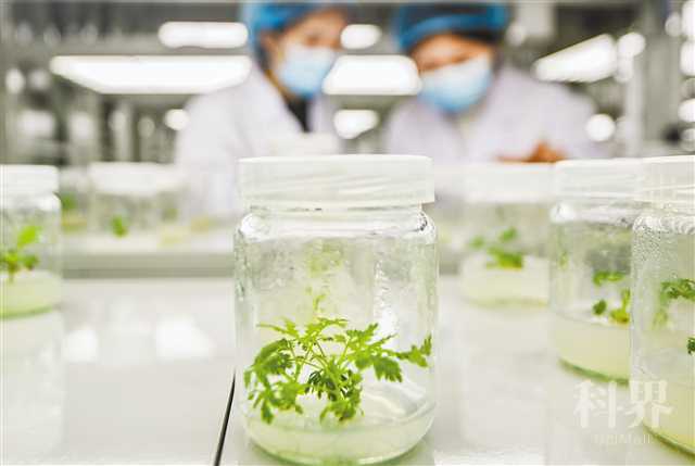 1月11日,西部(重庆)科学城种质创制大科学中心,科研人员正在观察青蒿组培苗生长情况。