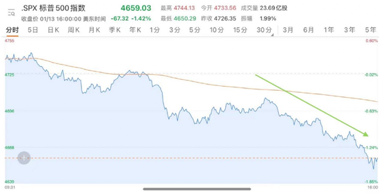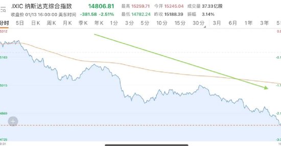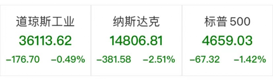道指收跌176.7点,跌幅0.49%,报36113.62点;纳指收跌2.51%,报14806.81点,创去年10月13日以来收盘新低,最近四日首次收跌;标普500收跌1.42%,报4659.03点,创去年12月21日以来新低,与道指均结束两日连涨。