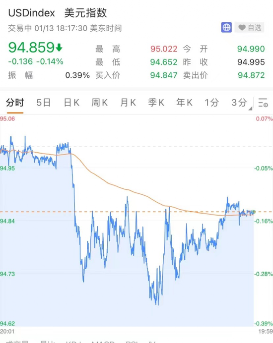 10年期美债收益率在美股盘中降至一周来低谷;美元指数跌幅扩大,布雷纳德听证会期间再次刷新去年11月以来新低,进一步脱离95关口。