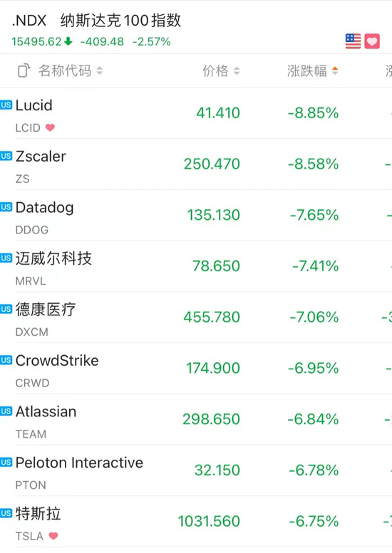 以科技股为主的纳斯达克-100指数下跌超400点,跌幅2.57%。大型龙头股、芯片股普跌。