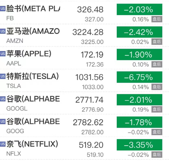龙头科技股中,微软收跌逾4.2%,市值大跌900多亿美元(约6000亿人民币)。奈飞跌超3.3%,亚马逊跌超2.4%,谷歌母公司Alphabet和原名Facebook的Meta跌约2%,苹果跌1.9%。