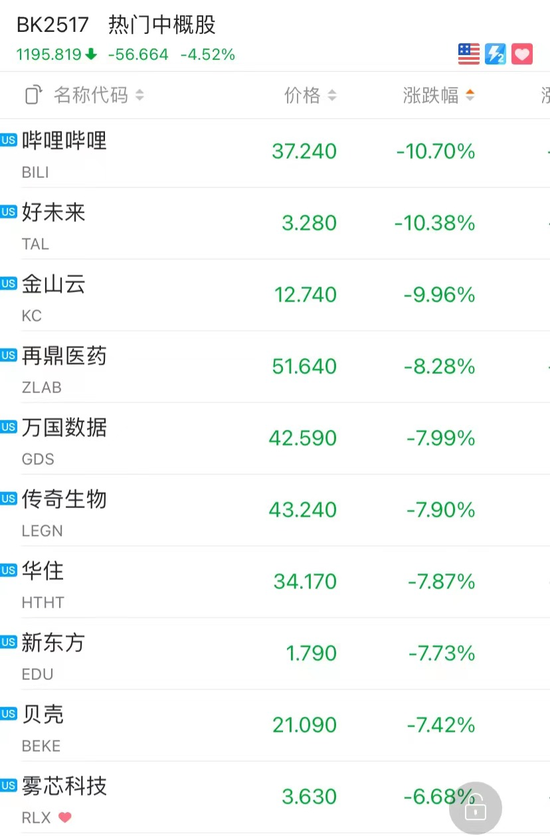 哔哩哔哩和好未来均收跌逾10%,新东方跌近8%,贝壳跌7.42%,雾芯科技跌6.68%,京东跌约6.5%,阿里巴巴、腾讯ADR、百度跌超4%,拼多多、蔚来汽车跌超3%,小鹏汽车、前程无忧跌超1%。