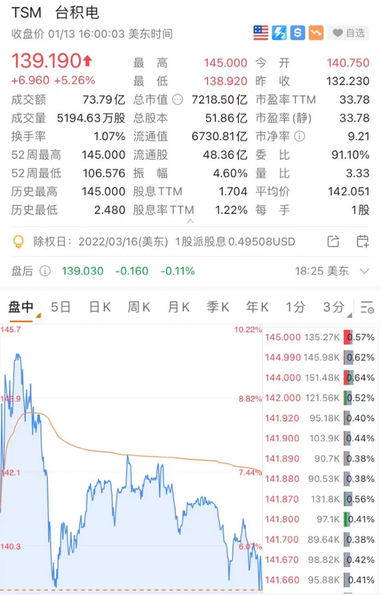 受四季度盈利和收入创新高拉动,台积电逆市暴涨5.26%,报收139.19美元,总市值7218.5,飙涨了380亿美元(近2500亿元人民币)。