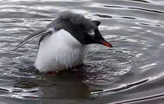 南极洲的白眉企鹅雏鸟在小水坑中学习游泳技能