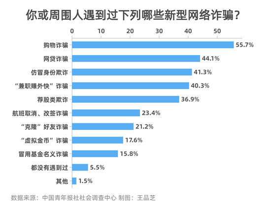 调查显示,受访者自己或周围人遇到过购物诈骗(55.7%)、网贷诈骗(44.1%)、仿冒身份欺诈(41.3%)、“兼职赚外快”诈骗(40.3%)等新型网络诈骗。其他还有:荐股类欺诈(36.9%),航班取消、改签诈骗(23.4%),“克隆”好友诈骗(21.2%),“虚拟金币”诈骗(17.6%)等,仅5.5%的受访者都没遇到过。