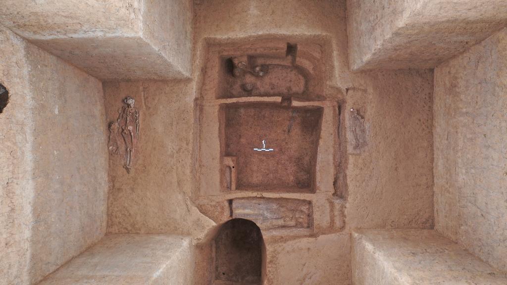 邵家棚遗址“中”字形大墓的墓室。(图片由安阳市文物考古研究所提供)已发掘的18座商代墓葬中,“中”字形大墓被盗严重,仅出土少量陶器和车马器等小件器物。