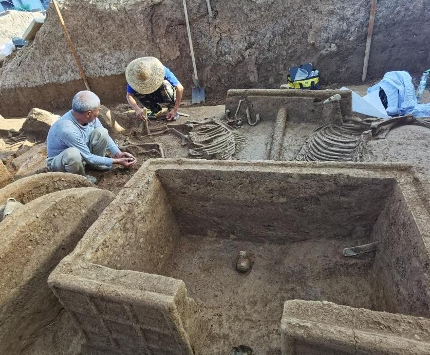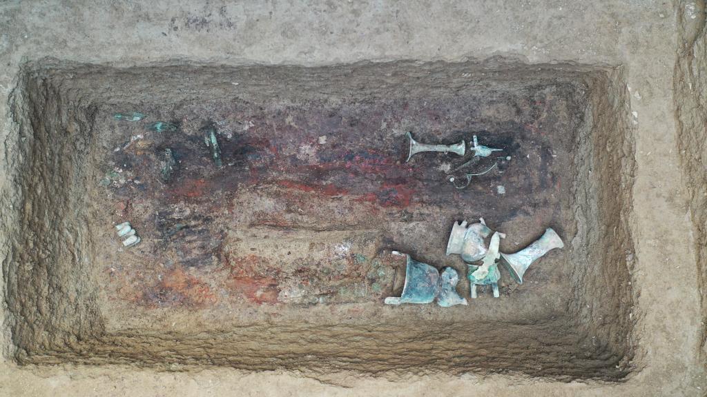 邵家棚遗址中的一座商代墓葬,其中出土了数量丰富的青铜器。(图片由安阳市文物考古研究所提供)“邵家棚遗址文化内涵丰富,各类遗迹保存较完整,出土器物多且种类丰富,对于研究殷墟遗址的范围、布局和殷墟南区商代遗址文化内涵、文化发展序列都具有重要的意义。”孔德铭说。