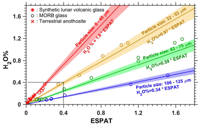 据了解,嫦娥五号光谱仪对采样区约2米×2米范围的区域进行了光谱观测,除了月壤之外还包括了一块没有带回来的岩石。探测发现岩石和月壤体现出不同程度的吸收。实验室的数据显示矿物中水的含量与其光谱吸收强度具有很好的线性关系,这个线性关系主要与粒径相关。根据目前已有月壤样品的测量,它们的平均粒径约60~80微米,据此估算嫦娥五号采样区的水含量在120ppm以下;而岩石中的水含量约为180ppm。相当于1吨月壤中大约有120克水,1吨岩石中大约有180克水。
