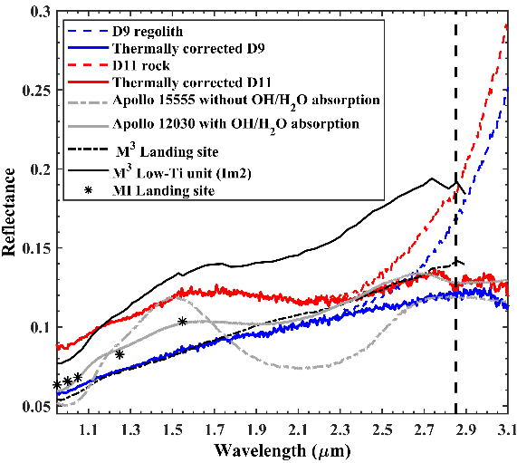 嫦娥五号着陆器上的月球矿物光谱仪对着陆点的月壤和岩石进行了反射率光谱测量,根据2.85微米的明确吸收特征,首次提供了月球上水的原位探测证据。嫦娥五号是目前唯一一次既返回样品又获取到月表原位光谱的任务,样品能够详细分析水在月壤颗粒中的分布、存在形式,并可利用同位素示踪来源,而原位光谱可以与轨道遥感建立联系,能够研究月表水的全球性分布和时间变化特征。月表水的分布可能与纬度高度相关,嫦娥五号是目前返回样品中纬度最高的,这对研究月表水的分布及来源具有重要意义。