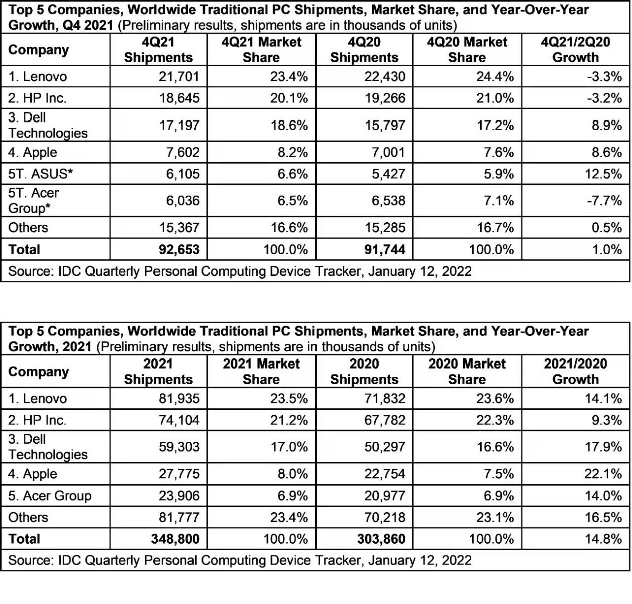 【环球网科技综合报道】1月14日消息,行业分析机构IDC近日发布的报告显示,2021年第四季度全球PC(台式机、笔记本、工作站)出货量约为9270万台。至此,2021年全年PC总出货量达到3.49亿台,同比增长14.8%,创自2012年以来PC市场年出货量新高。