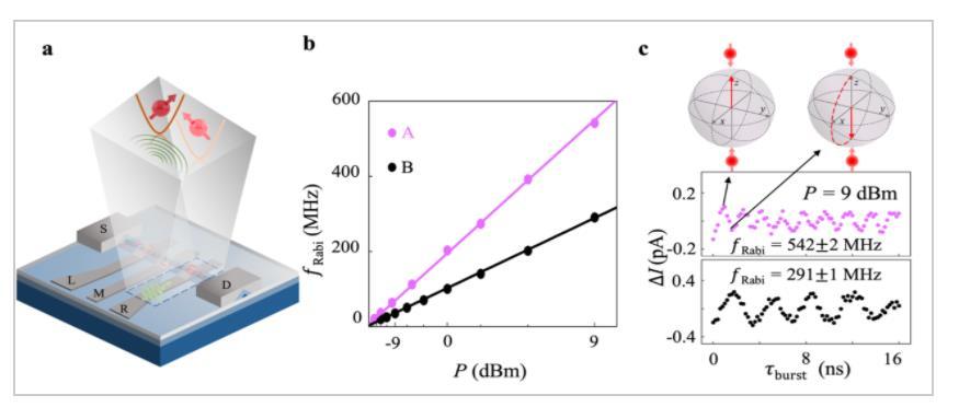 高操控保真度要求比特在拥有较长的量子退相干时间的同时具备更快的操控速率。传统方案利用电子自旋共振方式实现自旋比特翻转,这种方式的比特操控速率较慢。研究人员发现,利用电偶极自旋共振可以实现更快速率的自旋比特操控。电偶极自旋共振的一种方案是通过嵌入器件中的微磁体结构所产生的“人造自旋轨道耦合”来实现,但这会使自旋量子比特感受到更强的电荷噪声,从而降低自旋量子比特的退相干时间,同时降低自旋量子比特阵列的平均操控保真度,阻碍硅基自旋量子比特单元的二维扩展。另一种有效方案是使用材料中天然存在的自旋轨道耦合进行自旋量子比特操控。