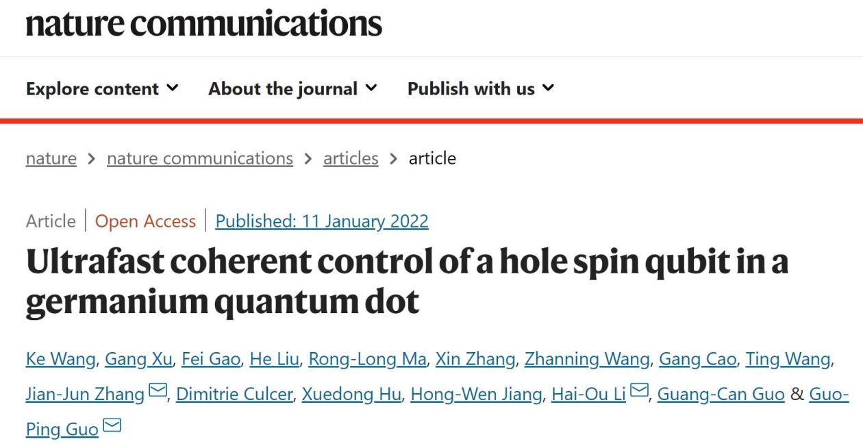 据悉,目前该研究成果以“Ultrafast coherent control of ahole spin qubit in a germanium quantum dot”为题已发表在 1 月 11 日的《自然》期刊上。