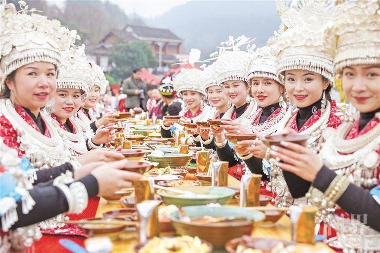 图为苗族长桌宴敬酒歌展演。