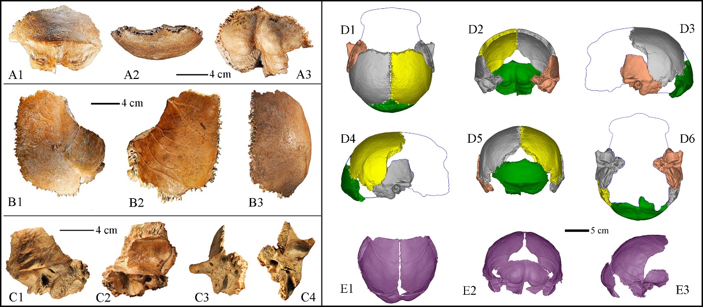 许家窑人头骨化石碎片及其复原的头骨和颅内模 吴秀杰供图