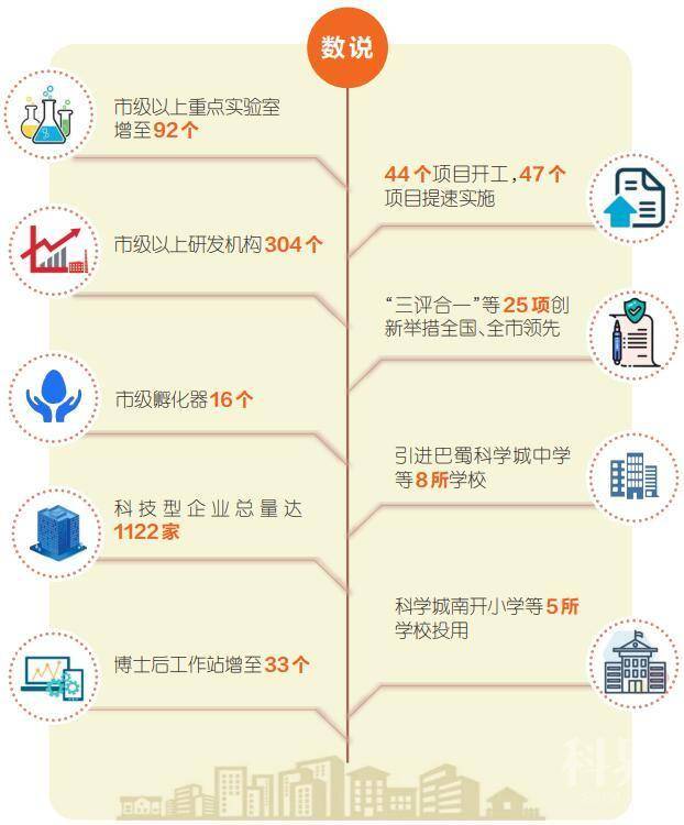 一年时间,科学城就新增高成长性科技企业7家、高新技术企业45家、科技型企业349家,市级以上研发机构增至304个。博士后工作站、科技创新人才分别增至33个、134人次,获批国家双创示范基地、海外离岸创新创业基地。