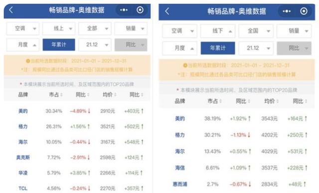 然而,2021年就没那么幸运了,格力从25年的销量冠军位置上走了下来,取而代之的是紧随其后的美的。据奥维罗盘数据显示,无论在线下还是在线上,美的的市场份额都超过了格力,成为新的“空调之王”。
