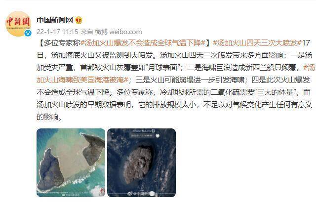 17日,汤加海底火山又被监测到大喷发。汤加火山四天三次喷发带来多方面影响:一是汤加受灾严重,首都被火山灰覆盖如“月球表面”;二是海啸巨浪造成新西兰船只倾覆,汤加火山海啸致美国海港被淹;三是火山可能崩塌进一步引发海啸;四是此次火山爆发不会造成全球气温下降。多位专家称,冷却地球所需的二氧化硫需要“巨大的体量”,而汤加火山喷发的早期数据表明,它的排放规模太小,不足以对气候变化产生任何有意义的影响。