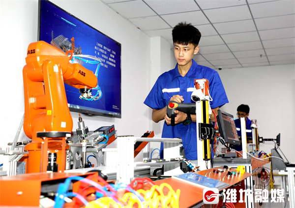 山东省智能制造公共实训基地的学员在调试工业机器人。