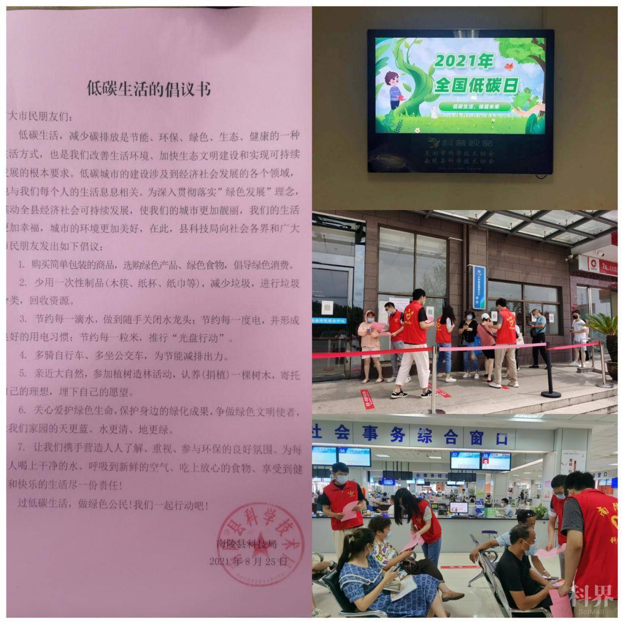 活动中,科普志愿者们在南陵县市民服务中心门前和阳光小区,通过现场讲解,向往来服务对象及居民发放低碳生活倡议书,利用市民服务中心科普视窗滚动播放低碳公益广告,普及绿色低碳发展理念,倡导低碳生产生活。呼吁广大市民珍惜一度电、一滴水、一张纸,在日常小事中践行节能理念,养成节能节水、循环利用、绿色出行、垃圾分类、光盘行动等好习惯,为保卫绿水青山、蓝天白云贡献出自己的一份力量。现场发放宣传资料200余份,解答22人次咨询。