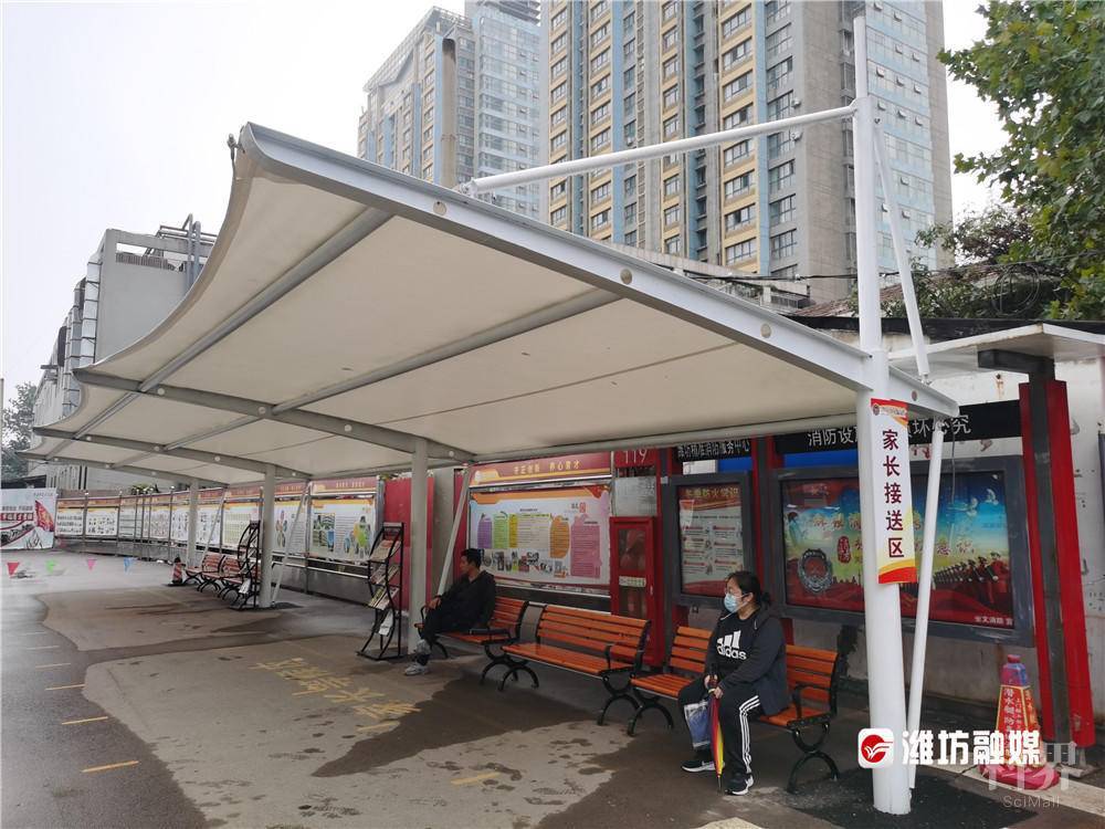 育才学校前遮阳棚下家长接待区,不仅有座椅还有阅报栏。