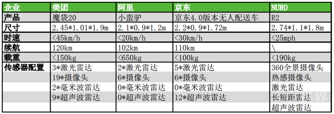 落地场景的选择其实对于企业来说至关重要,这不仅决定了公司在行业里的布局,也影响了无人配送车硬件的设计与选型,整体产品的设计思路。以最复杂场景为标准来设计产品无疑是最为安全与稳妥的方式,这点从各家的无人配送车产品中便能看出端倪,由此我们可以对目前市面上较出名的几家企业的无人配送车做一个盘点及横向对比。