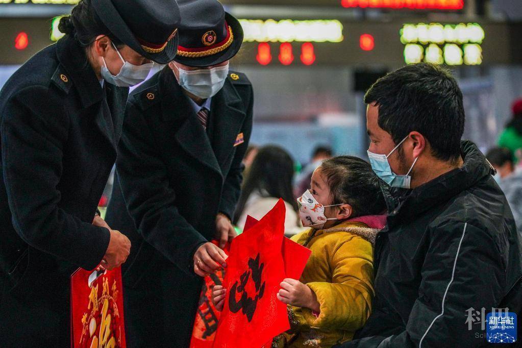 1月17日,贵阳客运段工作人员在贵阳火车站为候车旅客送上福字与春联。新华社记者 陶亮 摄