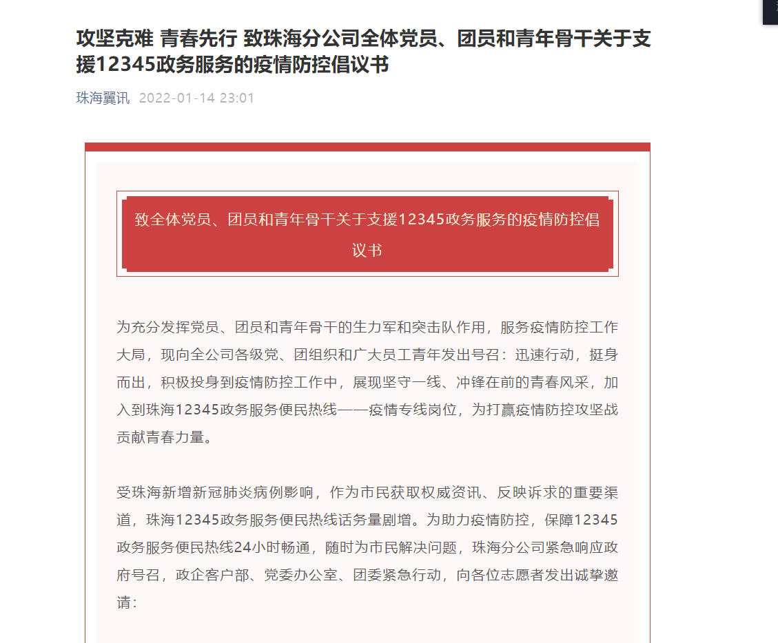 疫情突发,中国电信服务不间断。中国电信珠海分公司一线技术人员始终坚守岗位,积极为装维工单预约调度,保障客户装维快装快修,同步做好管控区域客户的解释安抚工作。同时,中国电信珠海分公司发布疫情防控倡议书,号召公司全体党员、团员和青年骨干主动加入12345便民服务热线疫情专线岗位,充分发挥党员、团员突击队和主力军作用,切实践行青年骨干的使命与担当。