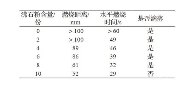 从下表中可以看出,当遇到火情时,沸石良好的阻燃性能将极大的降低火势的蔓延,增加生命财产安全。当添加沸石粉后,复合材料燃烧距离和燃烧时间逐渐降低。重庆工商大学融智学院的柏芳燕等人通过试验研究证明,随着沸石粉含量的提高,添加沸石的复合材料游离水和结晶水在受热时挥发,减少了复合材料的燃烧时的温度,并且沸石粉是具有较大比表面积的多孔矿物,能够通过范德华力吸附燃烧时产生的液化物,在一定程度上减少了燃烧物的滴落。