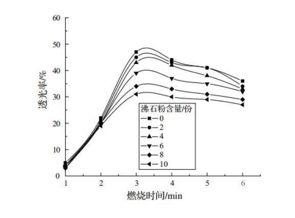 下图为沸石含量在复合材料中变化对烟密度的影响。可以看出,随着样品燃烧,透光率呈先升高后降低的趋势,并在3~4min左右出现最高值。并且,样品最大烟密度随着燃烧沸石粉含量的增加而逐渐降低,在添加10份沸石后,燃烧至3min时的透光率从纯PVC下的47%降至31%,下降了34%左右。出现该现象可能的原因有两点,首先是沸石粉中的多孔结构能够有效吸附燃烧产生的烟雾,并通过“分子筛”作用吸附起来;其次是沸石粉空隙中的游离水和结晶水在受热时挥发,带走部分热量,减少了复合材料的燃烧,从而达到降低烟密度的目的。