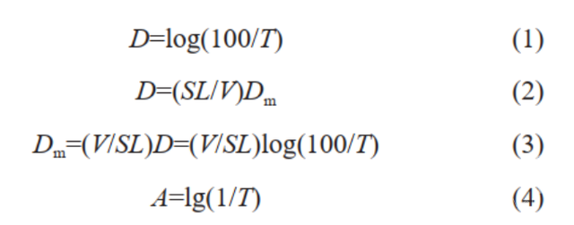 重庆工商大学融智学院的柏芳燕等人在NBS烟密度箱试验中,试样经过明火燃烧,释放出烟气,基于比尔-朗伯定律(Beer-Lambertlaw)(式(1)~式(4)),在一定测试环境下,烟密度和吸光度呈正比,通过光学测量装置,可以获悉其光学透过率的变化,进而测试沸石阻燃时的烟密度状态。